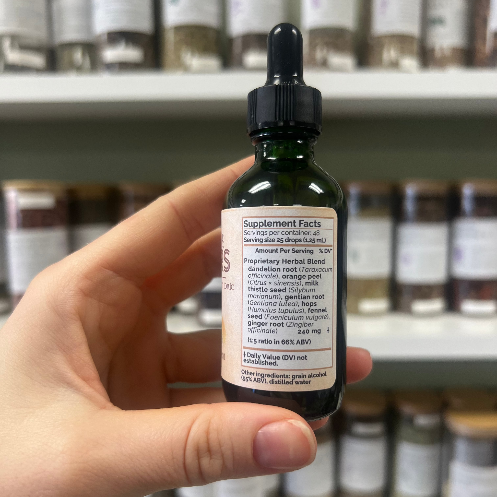 Ingredients: Dandelion root (Taraxacum officinale), orange peel (Citrus Γ sinensis), milk thistle seed (Silybum marianum), gentian root (Gentiana lutea), hops (Humulus lupulus), fennel seed (Foeniculum vulgare), ginger root (Zingiber officinale),Β grain alcohol (95% ABV), distilled water