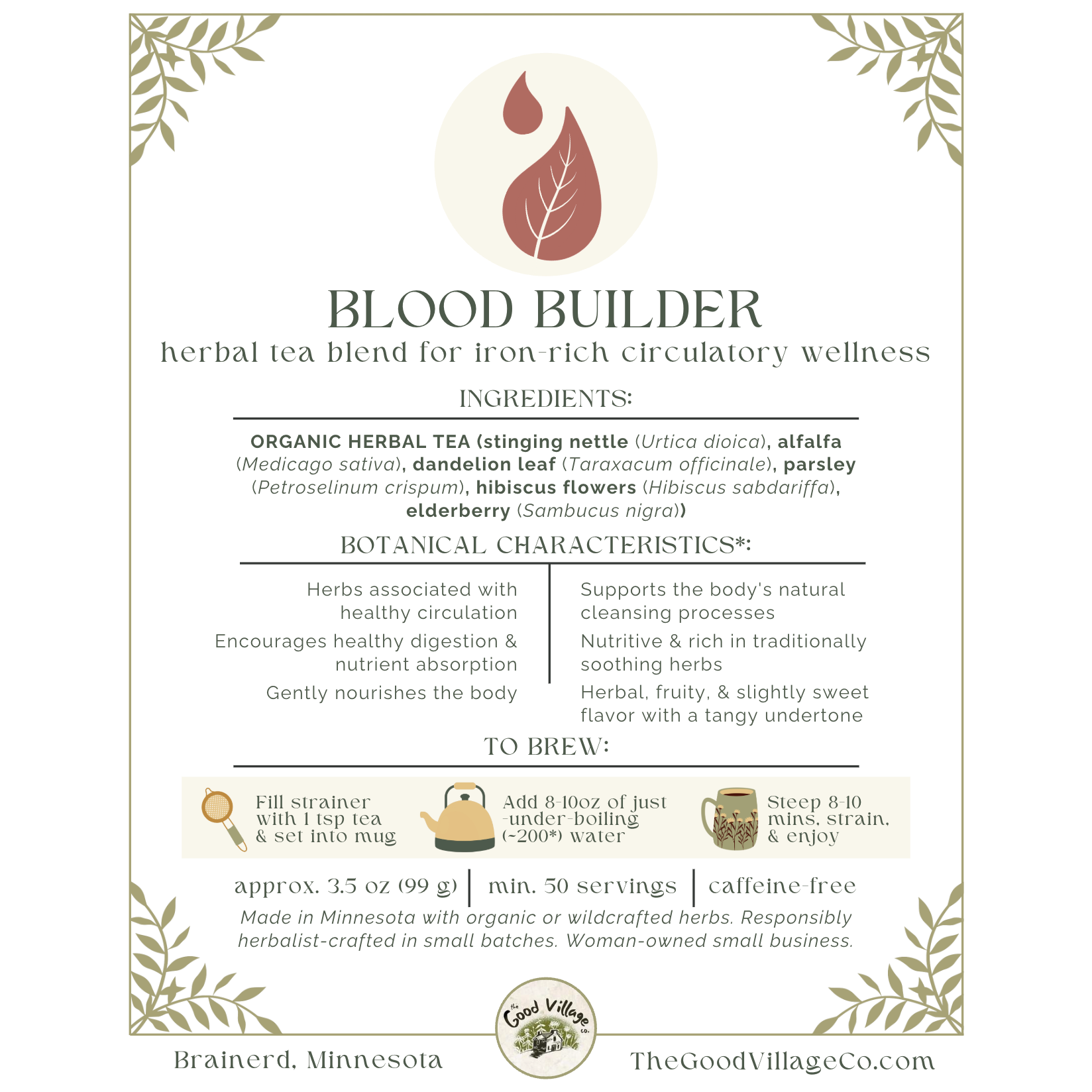 Production Notes: Responsibly hand-blended in small batches. Made in Minnesota with organic or wildcrafted herbs. Herbalist-crafted and packaged with care. Woman-owned small business.