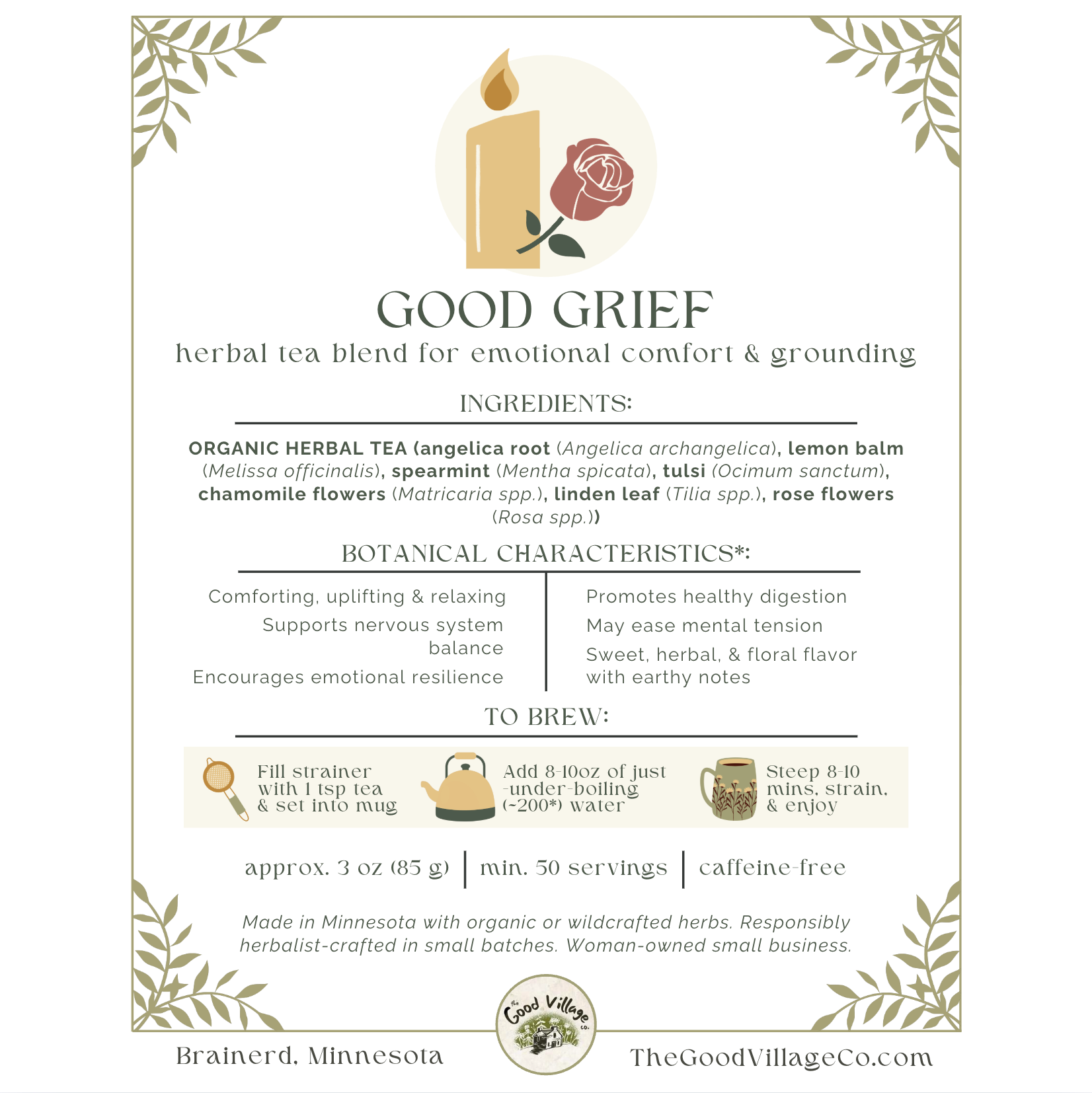 Lean on Good Grief Tea for a nurturing blend that offers calm presence in a cup—helping the body & mind unwind, the breath steady, & the heart soften.