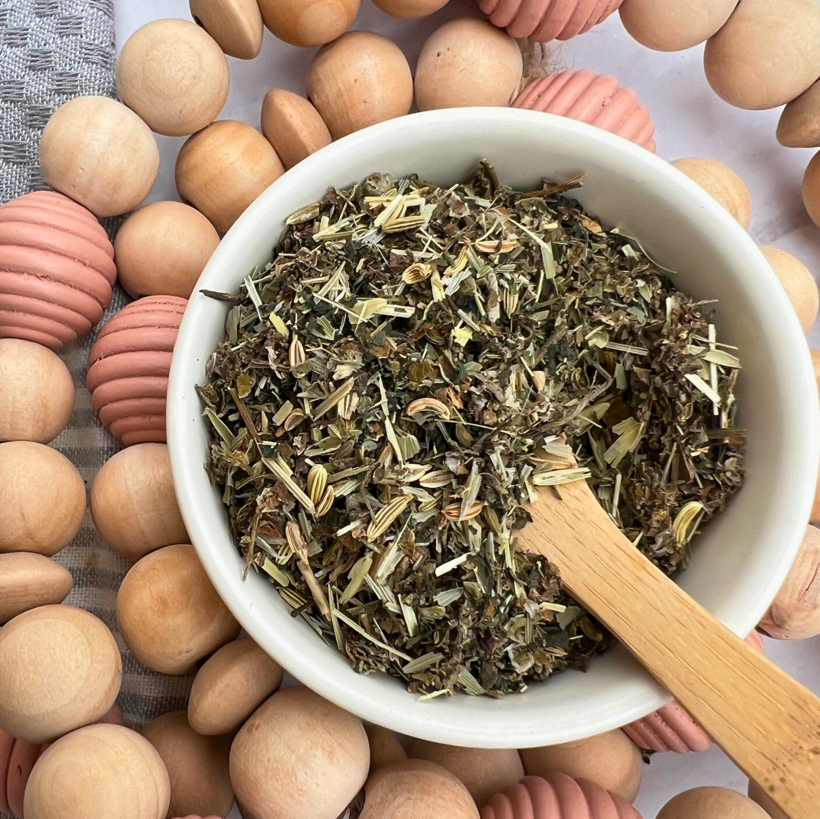 Mama’s Milk is a nourishing herbal tea thoughtfully crafted to support new mothers in the early days of breastfeeding. This blend combines gentle, mineral-rich herbs traditionally used to encourage healthy milk flow, replenish the body after birth, & provide calm, balanced support for both Mama & baby. Designed for daily nourishment, Mama’s Milk helps sustain steady energy, promotes healthy digestion, & supports emotional grounding during the postpartum period.