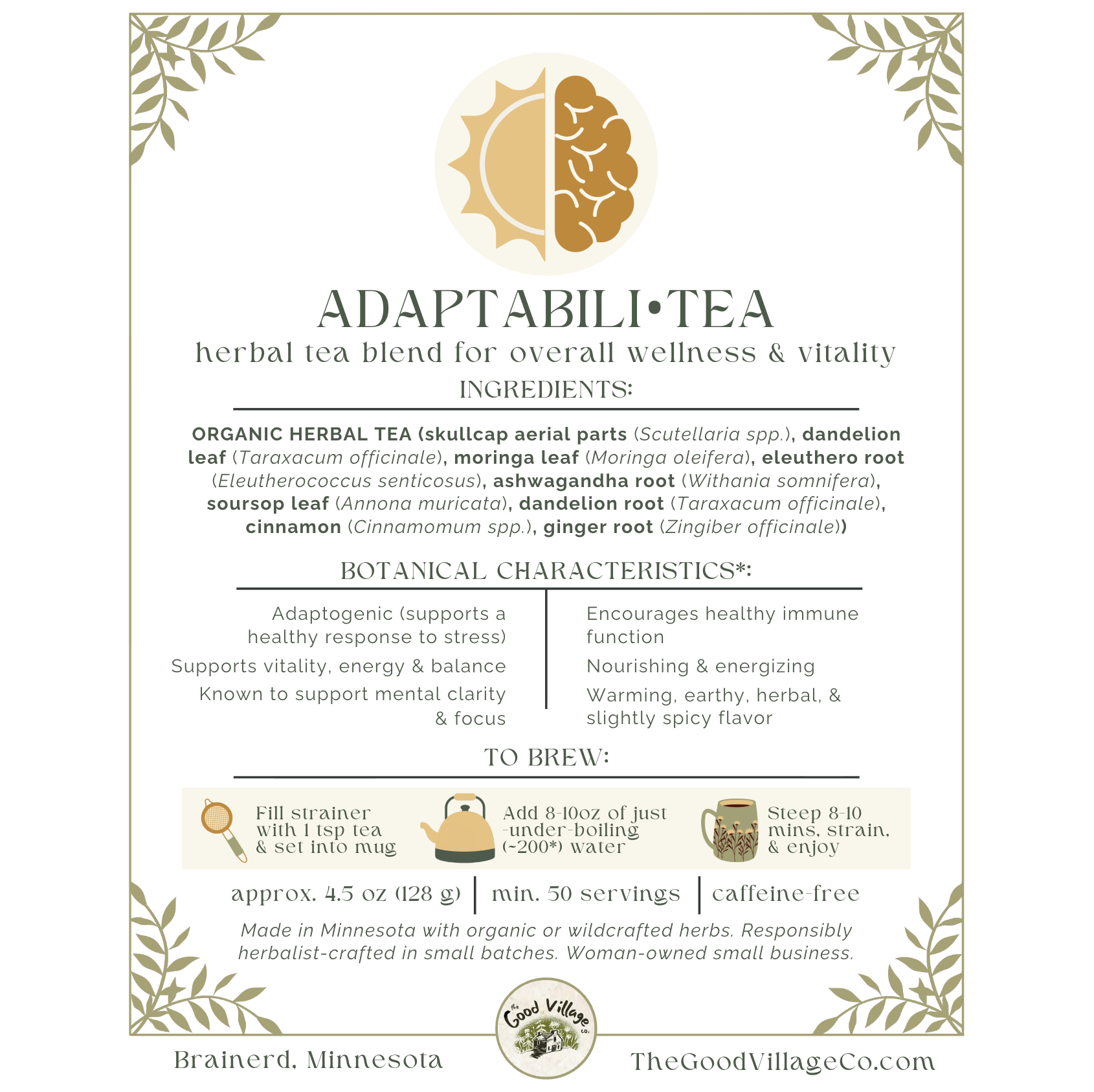 Ingredients: skullcap (Scutellaria spp.), dandelion leaf (Taraxacum officinale), moringa (Moringa oleifera), eleuthero (Eleutherococcus senticosus), ashwagandha (Withania somnifera), soursop (Annona muricata), dandelion root (Taraxacum officinale), cinnamon (Cinnamomum spp.), ginger (Zingiber officinale)