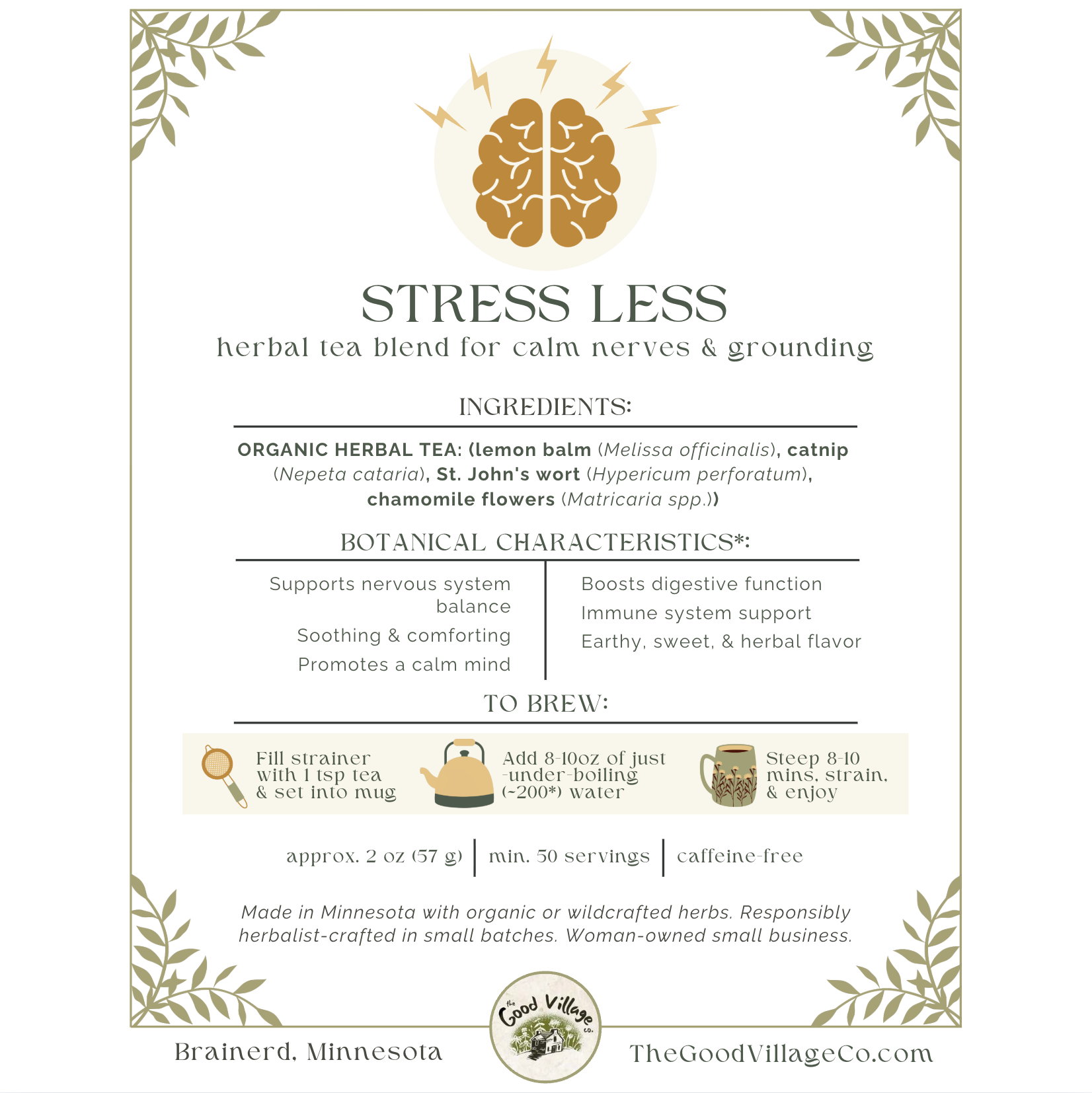 Stress Less is a restorative herbal tea thoughtfully crafted to help unwind the body & mind from the inside out. Designed for those experiencing the effects of chronic or compounding stress, this blend works gradually to regulate mood, calm tension, & support emotional balance over time. With daily use, Stress Less encourages the body’s natural ability to relax, rebuild, & restore equilibrium—helping you meet life’s challenges with a steadier, more grounded sense of calm.