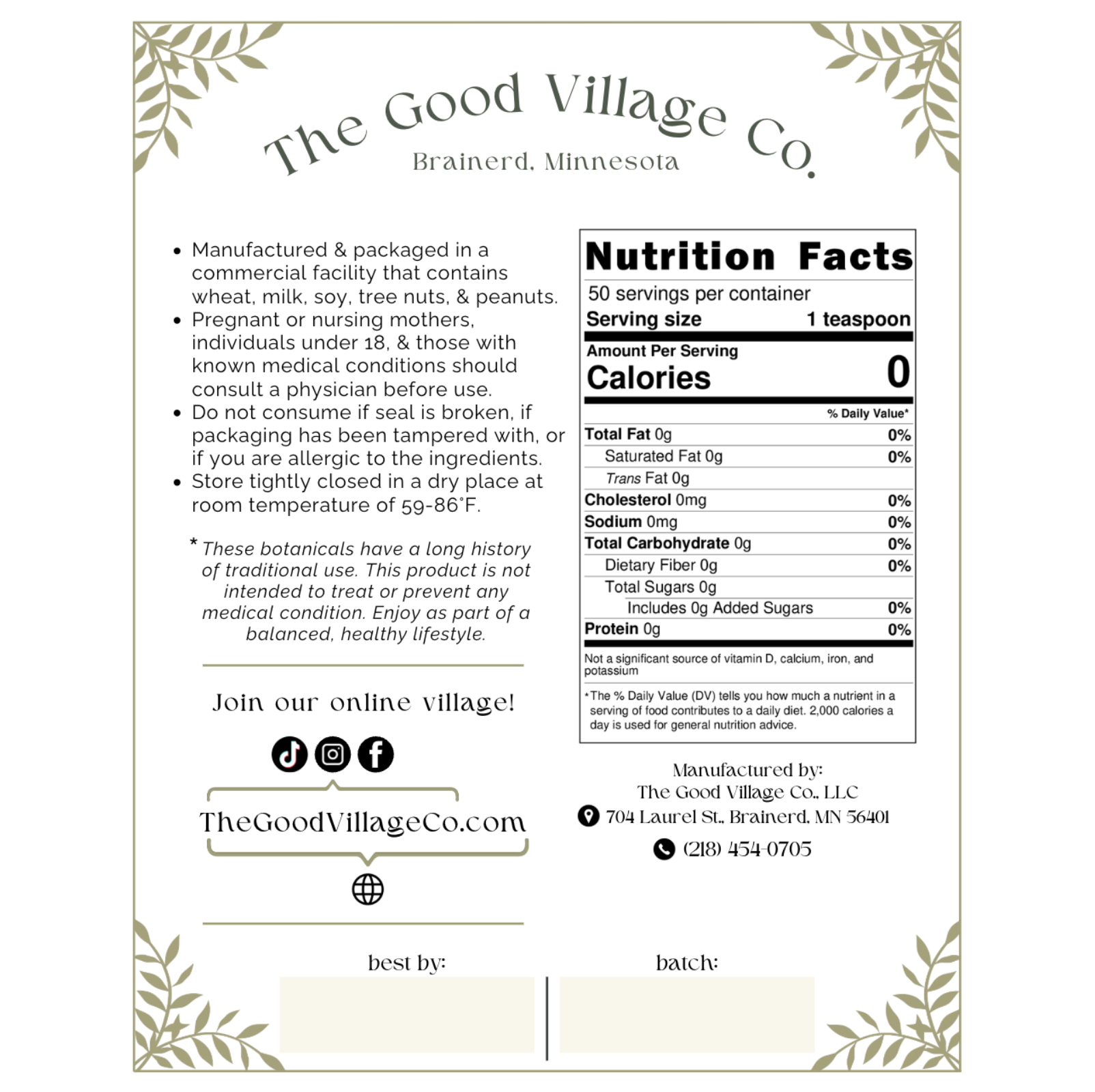 Production Notes: Responsibly hand-blended in small batches. Made in Minnesota with organic or wildcrafted herbs. Herbalist-crafted and packaged with care. Woman-owned small business.
